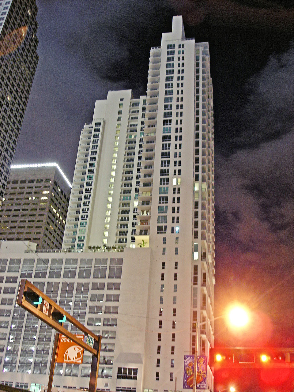 Photos of Miami-Dade County at night. Night photograpy is easy wiht today's automatic digital cameras. This was taken with an inexpensive Sony digital cameral from a a stoplight on Brickell Avenue. With a night camera setting, I was careful not to move my hand too much and there was enough light to get a decent shutter speed. The lines of the Plaza Condominium agains the cloudy black sky makes an interesting contrast. The second photo is of the Bank of America Tower (formerly the Centrust Tower) in Miami-Dade, Florida. |