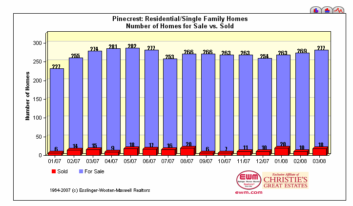 The Village of Pinecrest's inventory of homes has grown from 254 homes on the market in December 2007 to 277 homes in March 2008.  There is a one month lag in the data reporting.  Sales are indicated in red. Absorption is arrived at by dividing the supply by the demand which is 15.4 months. Exposure and marketing times may differ from absorption.