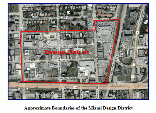 The Miami Design District is primarily located in a twelve square block area between N.E. 38th Street on the south to N.E. 41st Street on the north, and from North Miami Avenue on the west to N.E. 2nd Avenue on the east. This area primarily contains businesses that cater to the architectural and interior design business. Typical shops and offices include architectural and interior design firms, furniture stores, lighting, flooring, plumbing fixtures, carpeting, antiques, upholstery shops and related businesses. The area is now vibrant with numerous architecturally significant buildings which have been renovated. The Design and Architecture Senior High School is located on N.E. 2nd Avenue within the District and internationally known brands such as Fendi, Ligne Roset, Hestia and others are increasingly part of the retail presence in the area.