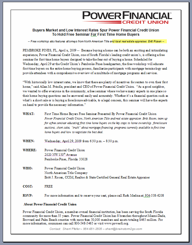 Britt J. Rosen, CCIM, of Brittex Appraisal Services, Inc.  along with attorneys from North American Title, speak at Power Financial Credit Union's First Time Homebuyer's Seminar of April 29, 2009.